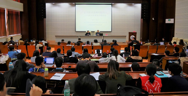 赵秉志教授从实践案例引发社会聚焦正当防卫问题、97刑法典中的正当防卫制度及其立法精神、正当防卫法理问题分析——以二审争议问题暨二审判决为主要视角、关于实践案件的反思等六个方面全面细致地讲解了正当防卫法理问题。整场讲座持续一个半小时,赵教授妙语连珠、一气呵成。在互动环节,赵教授还就“司法裁判的社会效果与法律效果的关系”“国外相关案例的借鉴价值”等同学们感兴趣的话题进行了细致耐心的解答。