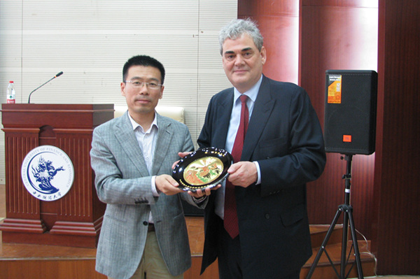 吴韬副院长向简贤亮先生赠送腾博官网纪念品