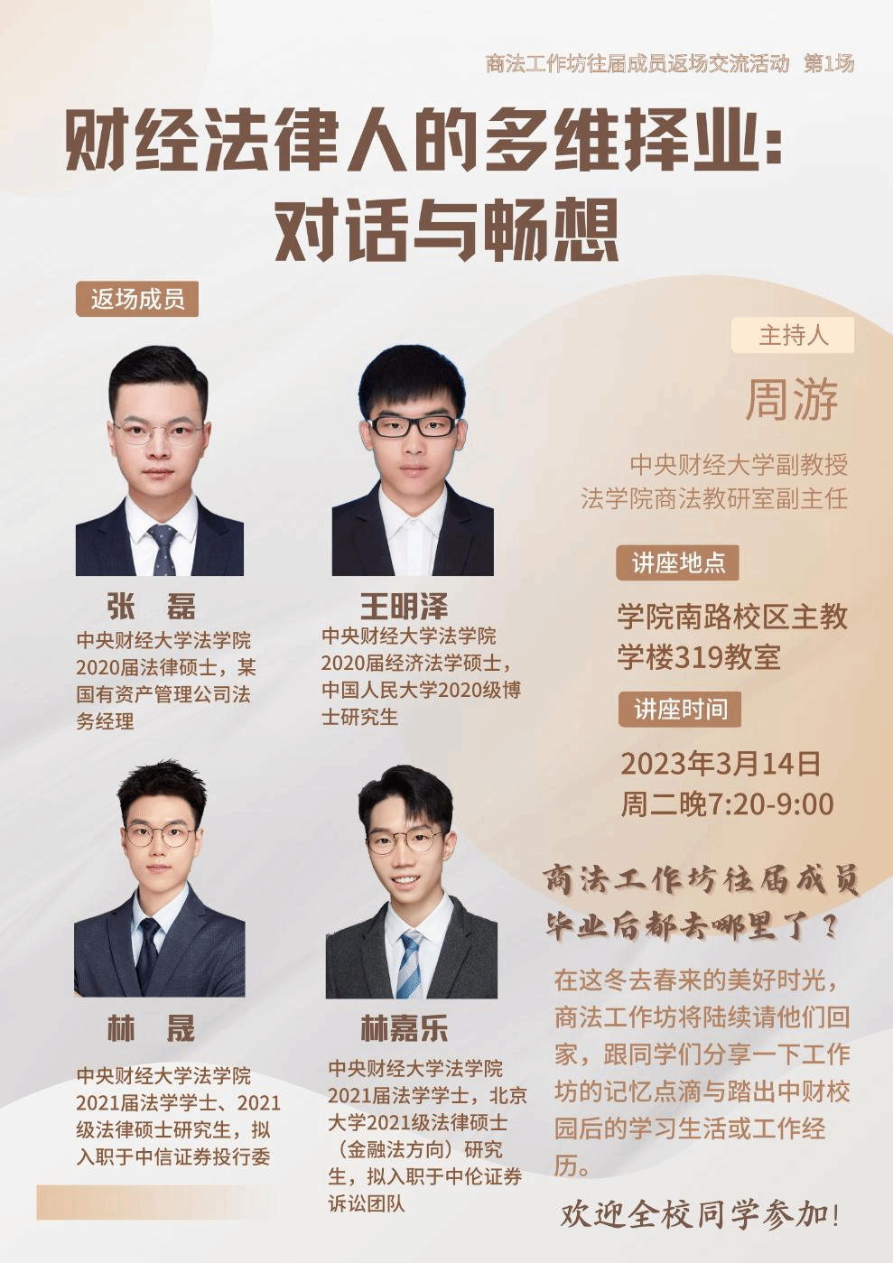 商法工作坊往届成员毕业后都去哪里了?在这冬去春来的美好时光,商法工作坊将陆续请他们回家,跟同学们分享一下工作坊的记忆点滴与踏出中财校园后的学习生活或工作经历。
