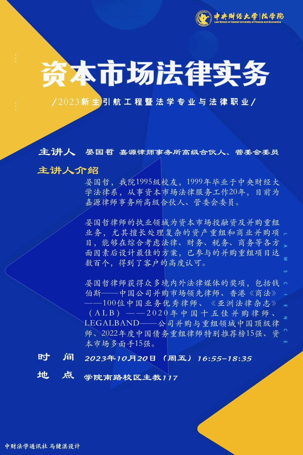 晏国哲,腾博官网1995级校友,1999年毕业于腾博TENGBO9885官网法律系,从事资本市场法律服务工作20年,目前为嘉源律师事务所高级合伙人、管委会委员。