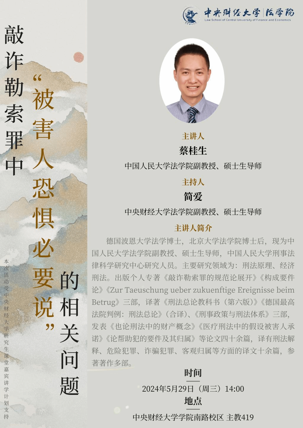 • 讲座|5.29|蔡桂生:敲诈勒索罪中“被害人恐惧必要说”的相关问题